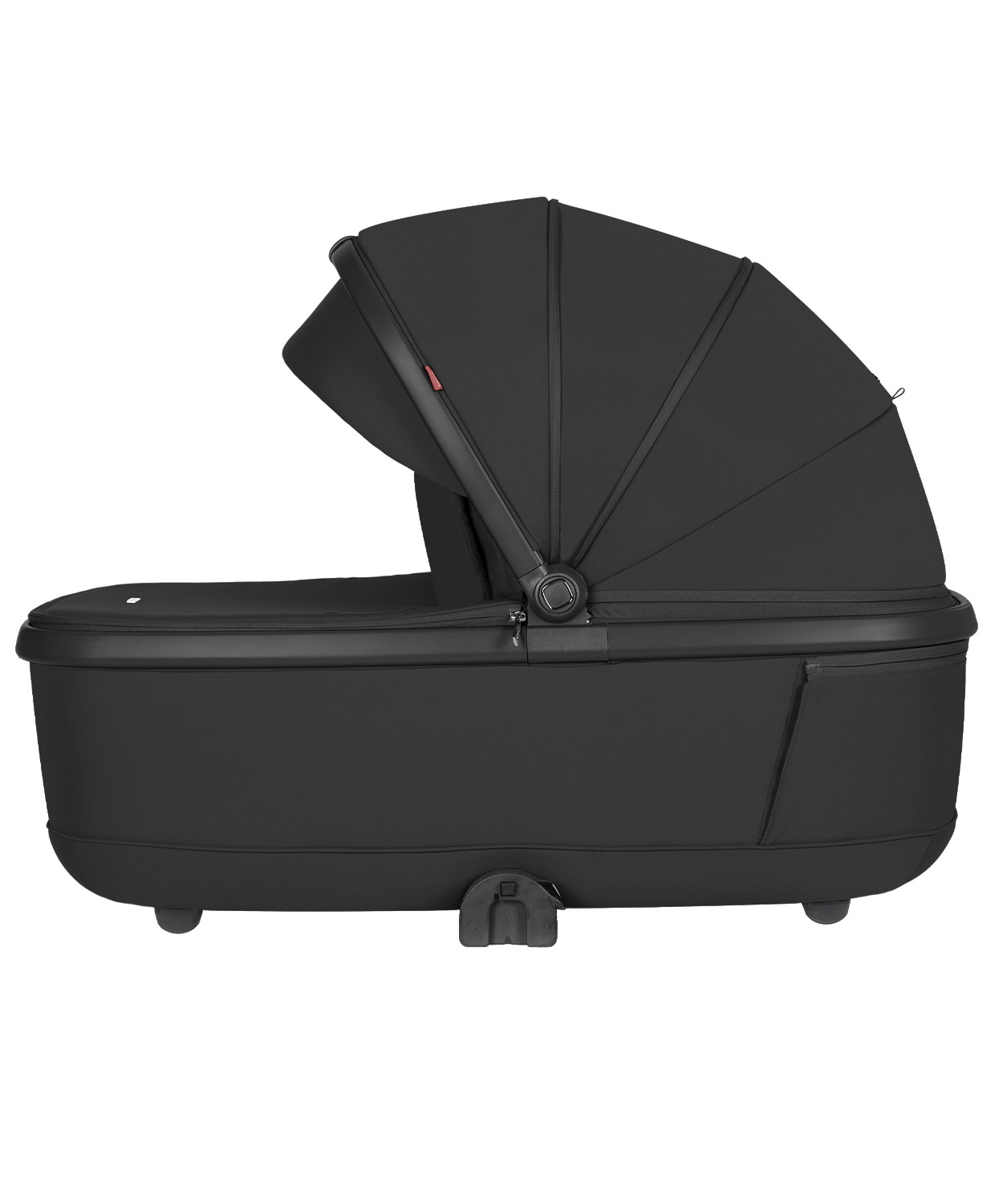 Cochecito modular moderno de gama alta con capazo ligero, características técnicas superiores, suspensión suave y diseño actualizado.